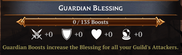 For every 3 boosts the Guild purchases, they will get a Skill Point towards their Guardianâs Blessing. These skill points unlock in a specific order: Life > Armor > Attack > Magic Up to a cap of 135 Boosts, for the whole Guild. As these Guardian Blessings are unlocked, they will apply Skill Points to the Guild membersâ attack teams during Daily Wars battles!