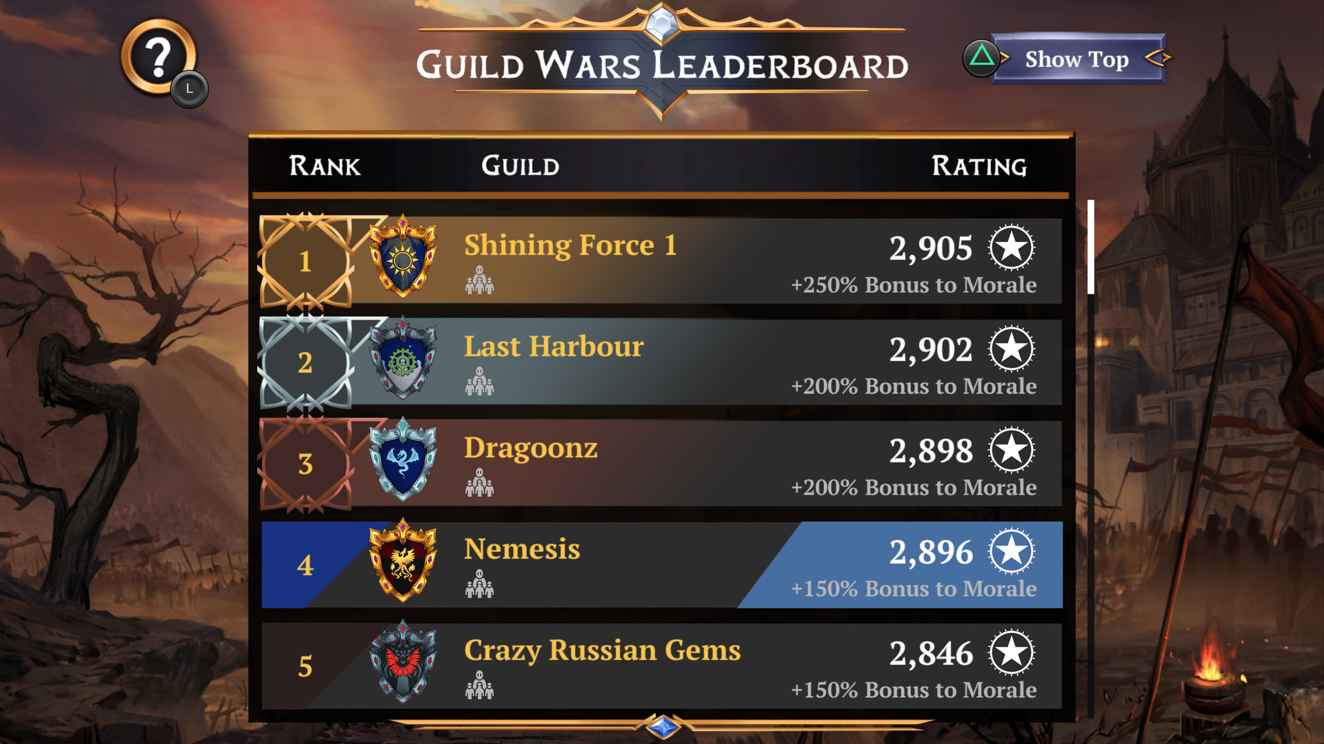 Shining force was in 4th they played a non existent guild and got 19 points for it which made them jump over 3 guilds to first this week. My guild the Dragoonz beat #1 Nemesis and only got 12 points for it, everytime we have played non existence guilds in the past we received 0 points and now they get 19 that’s the problem