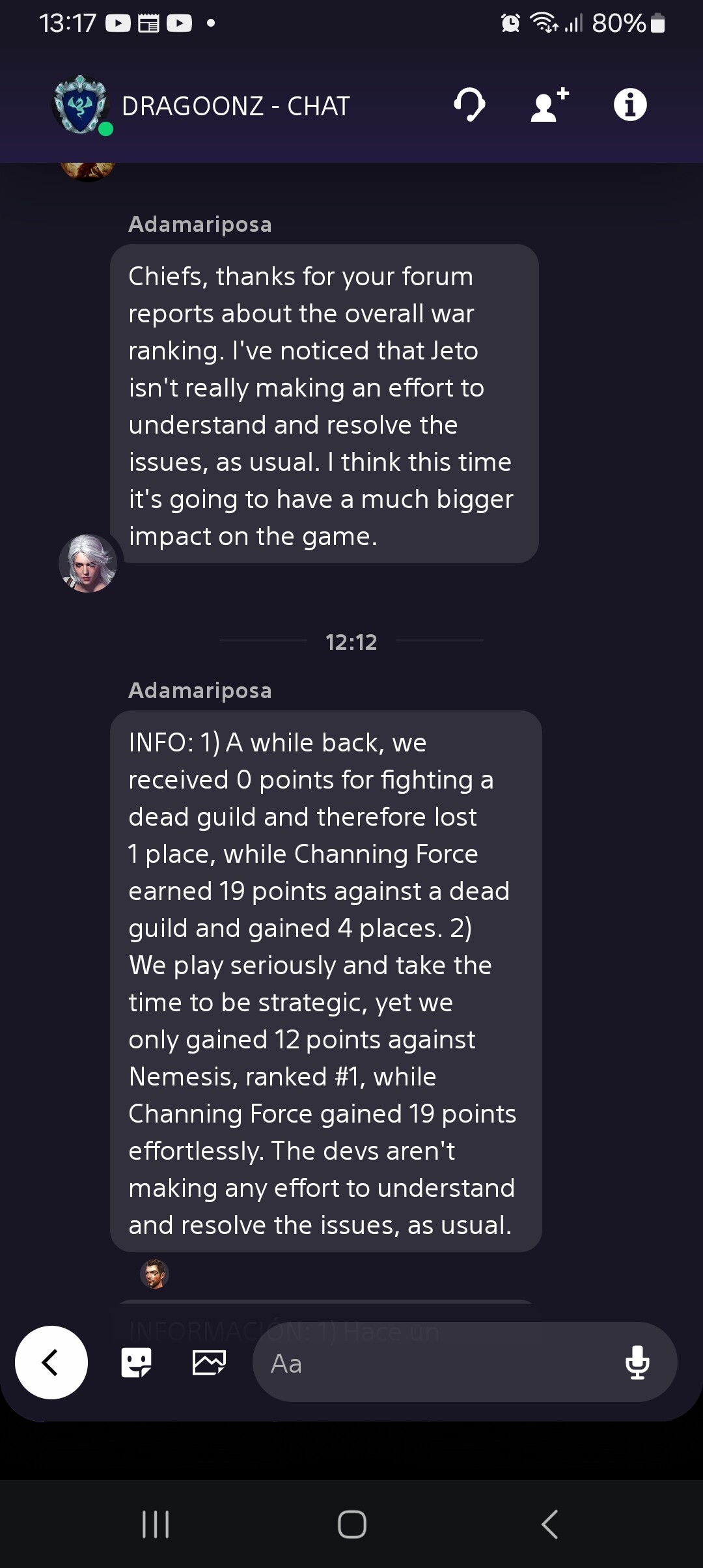 Thirdly, for whatever reason you make the obviously inane decision, again - without informing anybody, that free handouts from bot guilds should be worth more score given for battles against real guilds. The lucky ones now not only get free rewards but also free ranking positions that offer even more rewards. Those, who did not get lucky (either by facing freebie bot guilds when they gave no score, or by not facing freebie bot guilds at all), consider themselves doubly and triply screwed over by you.