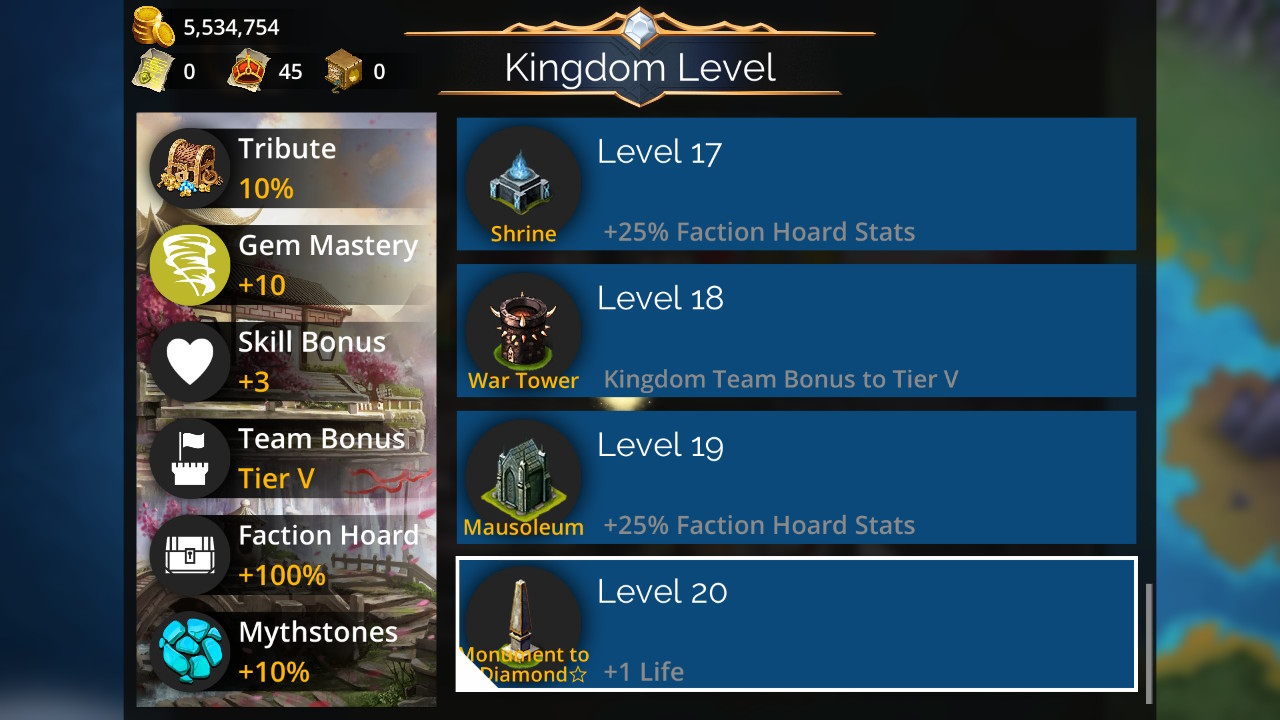 Of the other 35 kingdoms, I have 34 of them at Kingdom Level 18; only Dhrak-Zum is still at 16. (For some reason, I forgot to upgrade it on those occasions I’ve had the Books of Deeds even though Drifting Sands is one of my 20/30 spots.)