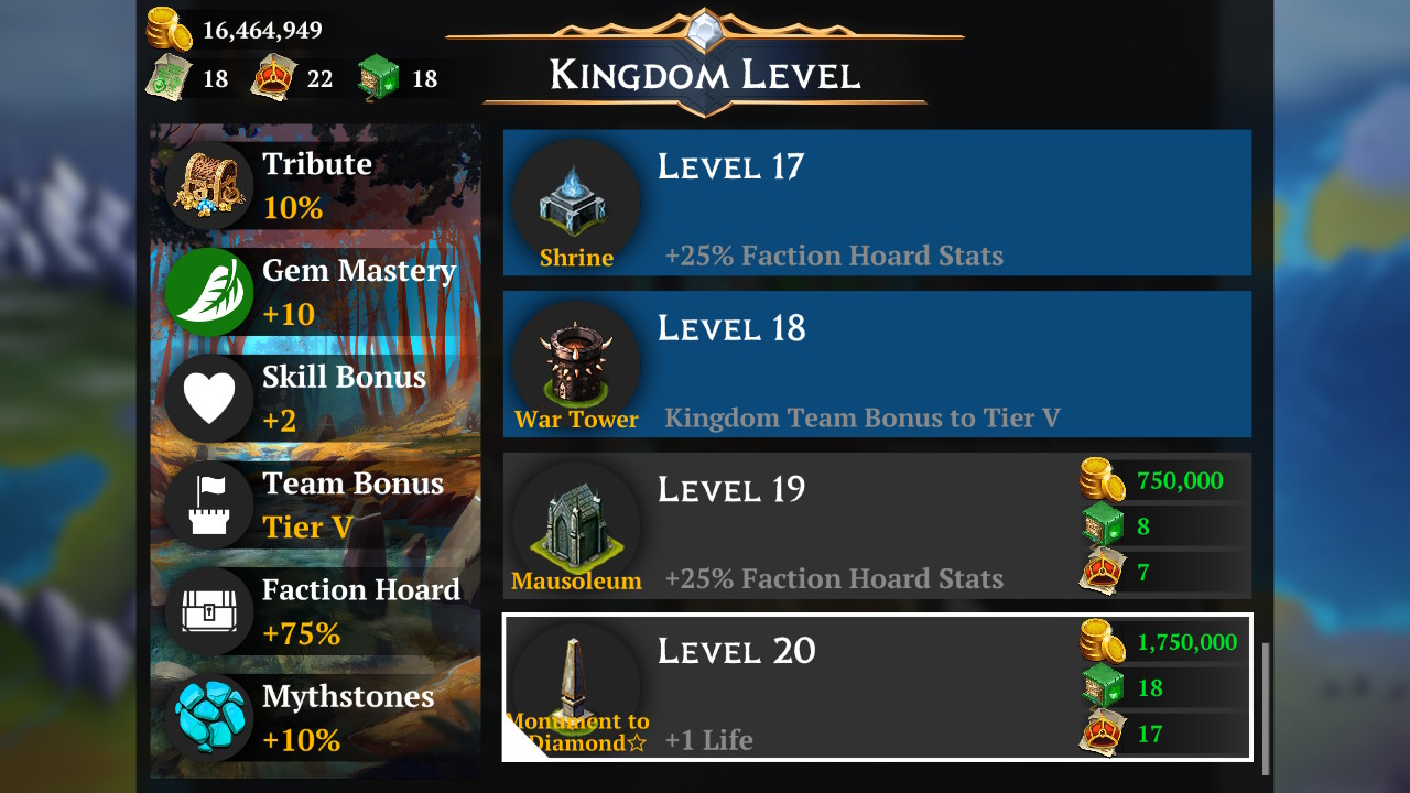 I have a question. If a kingdom is Level 20, but not Power 30 is there a way to see what the Kingdom bonuses are? I have a hard time remembering which are Magic and once they hit 20 it won’t let you view the type of bonus because ot says it is fully leveled. Am I doing something wrong?