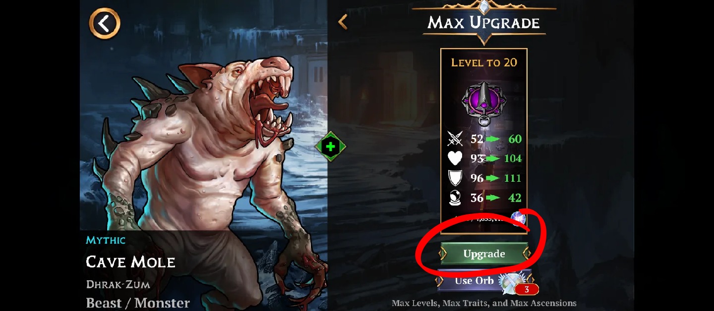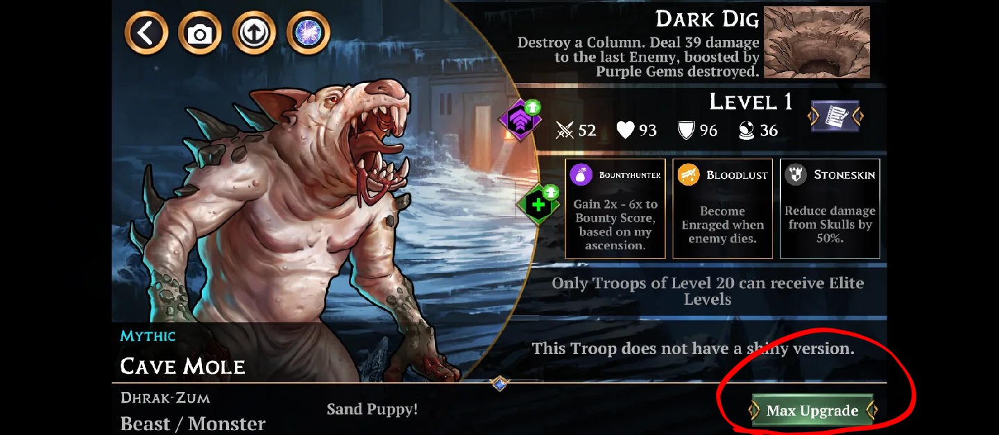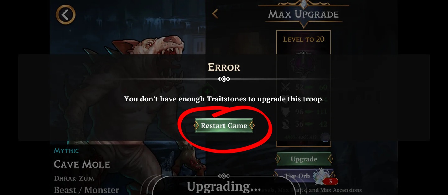 In Mobile, in the Troop Upgrade Menu, pushing the Max Upgrade button, when having not enough traitstones to unlock all 3 traits of a troop, leads to an Error Message and subsequent forced Game Restart