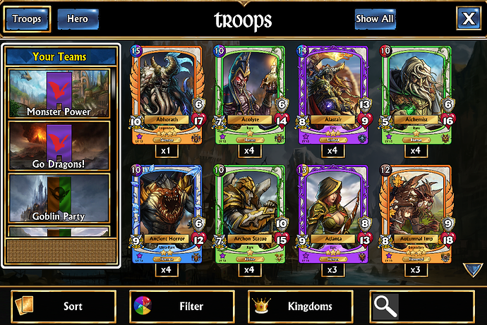 The Filter tab lets you sort troops according to their mana colour: