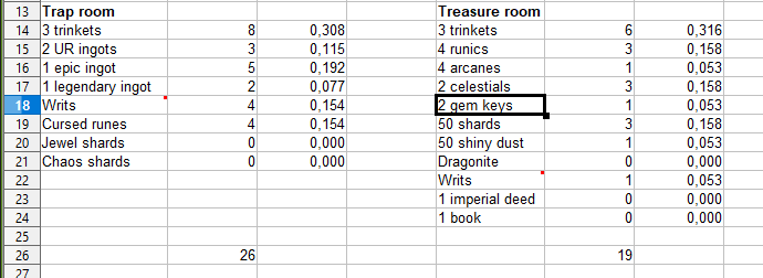 Rewardwise? Well, for Trap rooms writs are the only thing that matter, everything else is either completely useless (looking at you, ingots! You hold no value even for beginners.) or of marginal value for some accounts. Treasure rooms - worthless trinkets, worthless runics, worthless arcanes, worthless celestials (unless you’re casual beginner), okayish gem keys, okayish shiny dust, okayish jewel shards, okayish dragonite, okayish imperial deed…random book that’s good to have but will be something you see once in a blue moon.