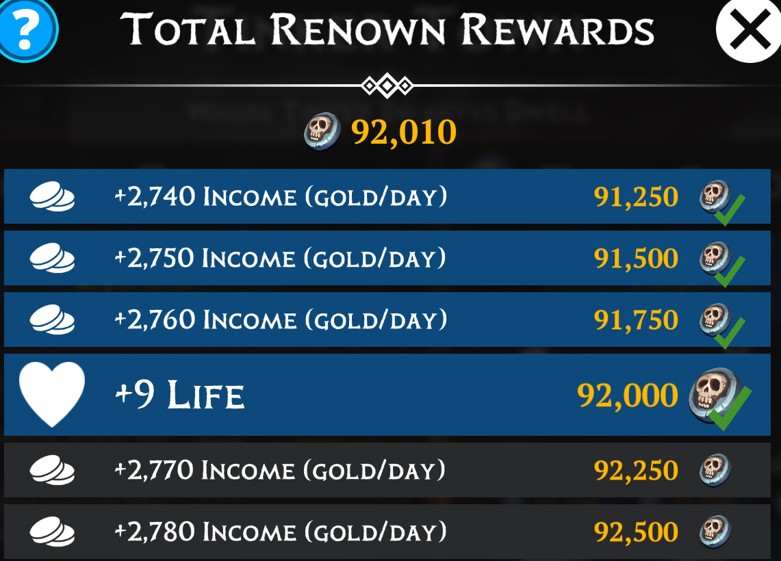 There you can see where you get your stat bonuses. In this view, you see you have Kingdom Bonuses (from leveling up your Kingdoms), Guild Bonuses (if you join a higher guild like mine, you’ll get the max which you see here and there are starting guilds which have lower guild bonuses. Note, a lot of the great guild families usually have max guild bonuses), and Renown Bonuses are from your Underworld Factions.
